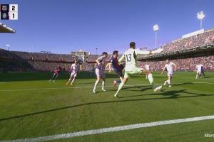 体育资讯03月30日讯 西甲第29轮,巴塞罗那vs赫罗纳。比赛第62分钟,加维挑传进禁区,费尔明头球摆渡,莱万在身位不正的情况下一个非常规动作的勾射破门,巴萨2-1再度领先!